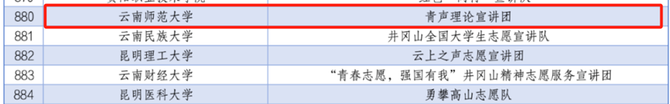 目前,团队有志愿宣讲员110名,分为4支宣讲队伍20余个特色主题,共开展常规宣讲180余场,社区宣讲20余场,受众达5万余人。宣讲团成员多次参加校内外宣讲活动,具有丰富的宣讲经验,通过开展青春分享课、“云师青年说”等特色活动,以“同龄人讲给同龄人听”等青年学子喜闻乐见的方式,把党的创新理论送到同学身边,在广大学生和社会群众中产生良好反响,光明日报、人民网、云南新闻联播等10余家媒体进行采访报道。