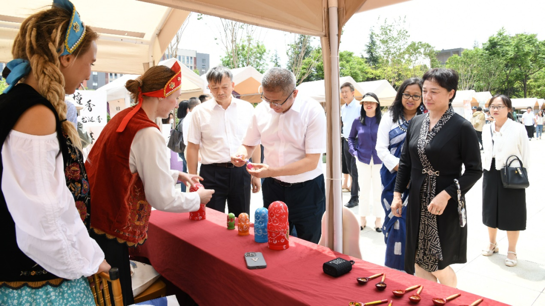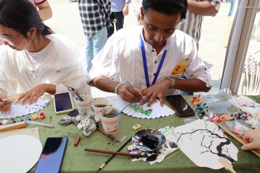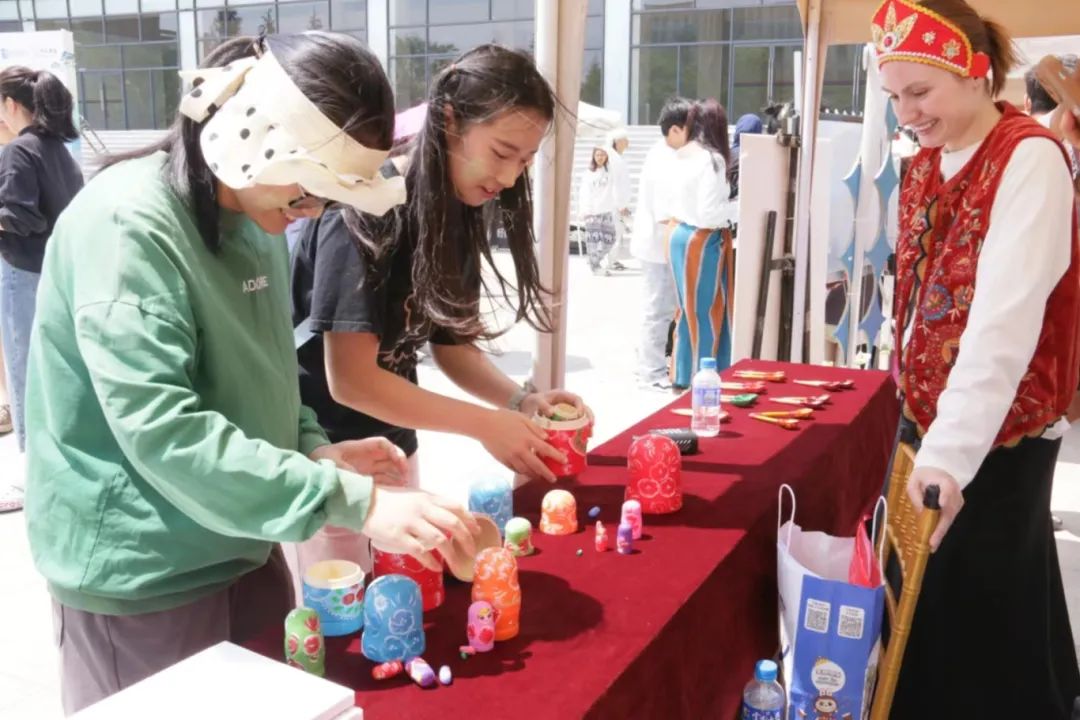 在中外民俗文化体验游园活动中,中式插花教学、手工团扇与香囊制作、书法展示、传统乐器演奏、汉服体验以及射艺让参与者目不暇接。留学生还设计组织了国别民俗文化体验活动,同学们开心学跳泰国舞;比拼拆开再重新组装俄罗斯套娃的速度;与印尼留学生一起游玩千年古典桌游“播棋”;向乌克兰留学生学习编制乌克兰花环。中外师生们兴致勃勃,沉浸式体验了各国民俗文化。
