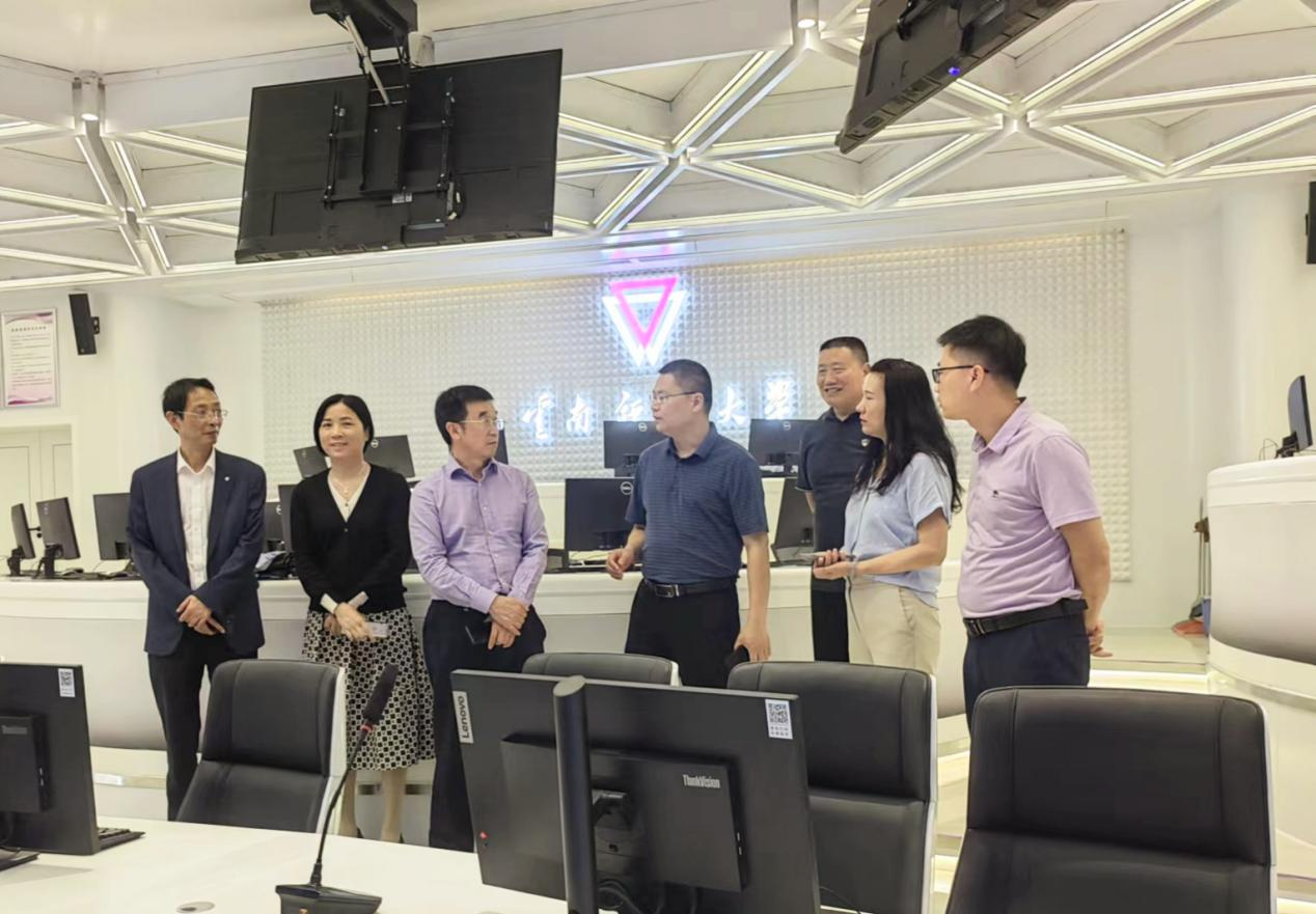 周明侠一行参观了传媒学院融媒体大数据实验室、演播实验室、专业录音室,体验了学院最新建成的大数据舆情系统、中央厨房、实景演播厅、虚拟演播室等。随后,又来到传媒学院与云南省媒体融合重点实验室共建的融媒学院,深入了解了实验室的重点工作室和重点项目。三方紧紧围绕人才培养和数字产业发展热点议题,进行深度解析、分享经验,聚焦数字人才生态建设,共话高素质数字人才培养以及教育数字化协同创新的新经验、新方法。