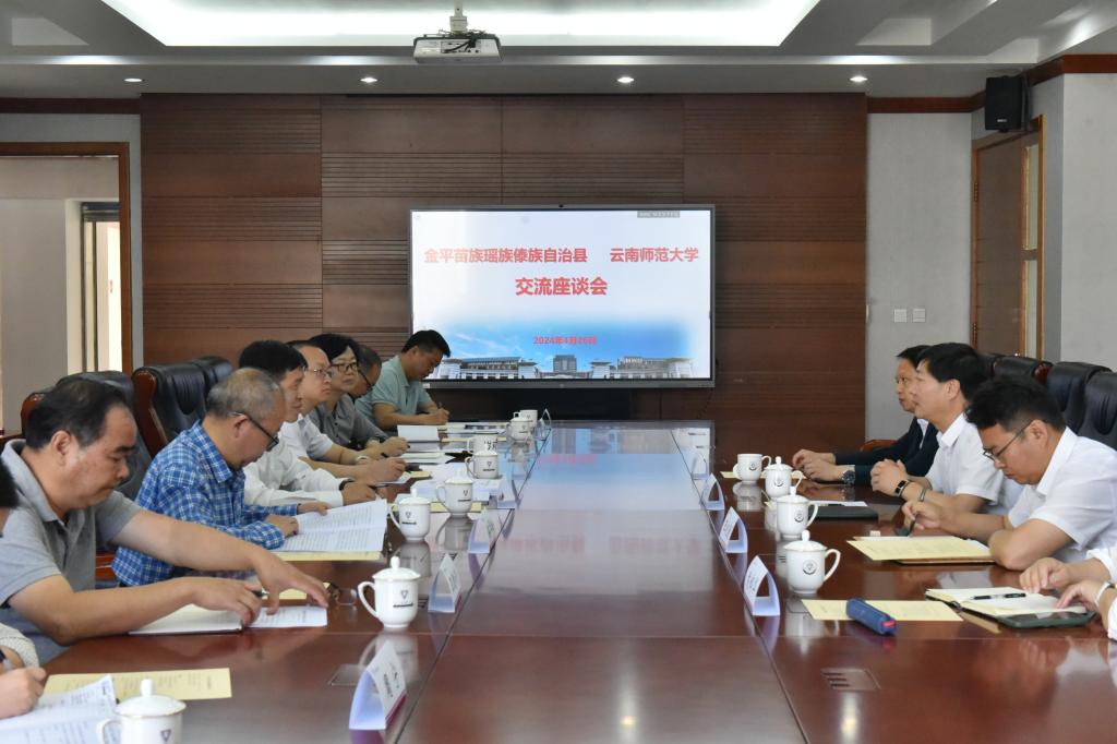 4月26日上午,校长胡金明在呈贡校区行政楼会议室主持召开金平县乡村振兴教育帮扶座谈会。金平县委书记余玉龙,县委常委、县委办公室主任王兆康,副县长熊伟,县教育体育局局长袁婷华,我校党办、校办、研究生院、乡村振兴办、基教集团办公室、党委教师工作部、对外合作交流处等部门负责人参加会议。