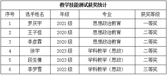 5月24日至5月27日,第十三届全国高校思政教育师范生教学技能测试与交流展示活动在四川师范大学举行。全国89所高校的547名学生参与比赛。我校马克思主义学院6名参赛学生参加比赛,获一等奖1项、二等奖4项、三等奖1项的佳绩。