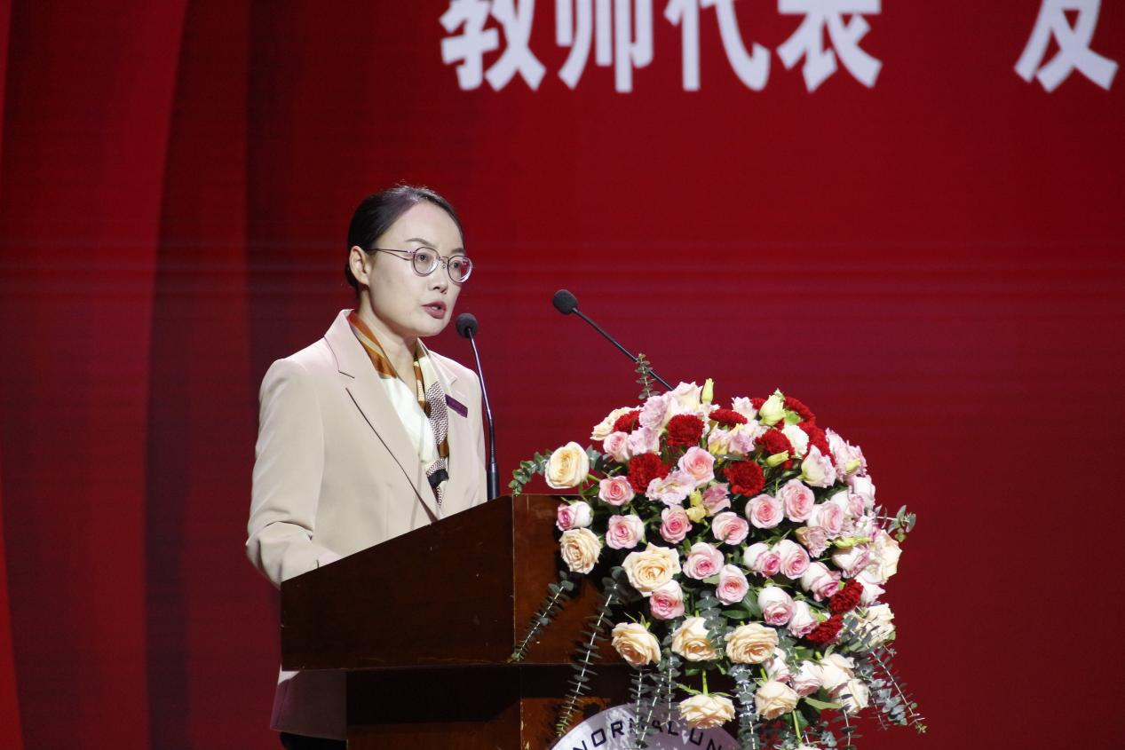 外国语学院杨霓老师作为教师代表分享了自己从学生到教师角色转变并与母校共进步的人生感悟。“教师的工作不仅是传授知识,更是塑造灵魂,影响未来。我们塑造的学生会拥有我们的印记,他们再带着这种印记去影响更多的学生。”她鼓励同学们要志存高远,心怀家国,以崇高的理想为动力,共同助力国家发展;要不畏艰险,勇往前行,用智慧和才华去创造美好的未来。