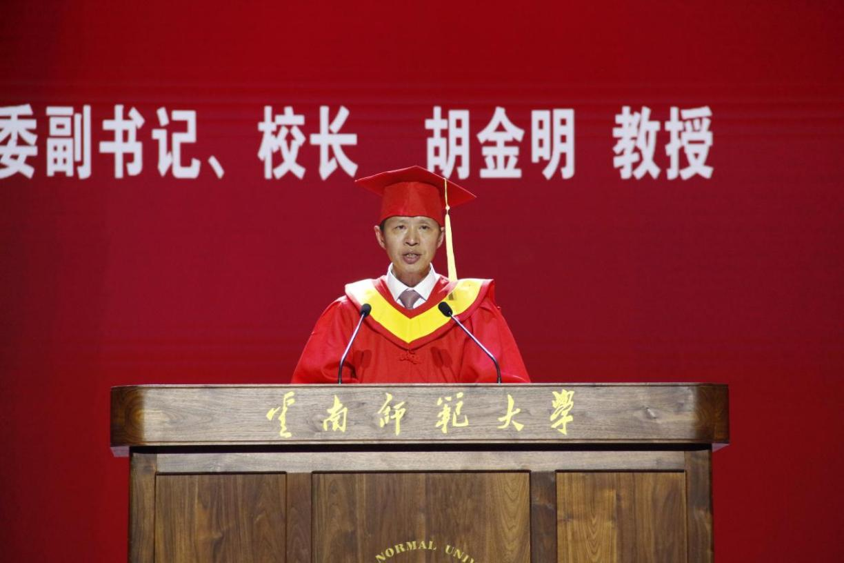 胡金明借用冰心先生赠友人葛洛的诗句“爱在右,同情在左,走在生命路的两旁,随时撒种,随时开花,将这一径长途,点缀得香花弥漫,使穿枝拂叶的行人,踏着荆棘,不觉得痛苦,有泪可落,也不是悲凉”送给毕业生作临别赠言,愿“爱”相伴一生。一是学会爱自己。无论什么情形下,都要爱自己,自爱者才能爱人,自爱是自我成长的永恒动力,也是播散爱的源泉。爱自己,才能刚毅坚卓、自强不息,迎接所有可能、挖掘所有潜能,让生命的价值饱满而丰盈。二是学会爱别人。“哪有什么岁月静好,不过是有人替你负重前行”。美好的岁月源于爱,不仅需要珍惜被人爱,更要学会爱别人。如果人生有主旋律,那一定是爱。三是学会爱国家。作为社会主义现代化国家建设的生力军,作为西南联大的传承人,要有一份坚定而浓烈的家国情怀。无论生活在哪儿,工作在什么岗位,只要胸怀祖国,踏实干事,就是对国家的爱。