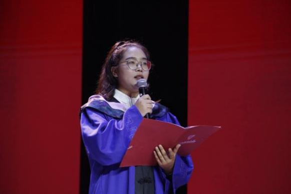 “学海无涯勤是岸,云程有路志为梯。”硕士毕业生代表杨愫深情回顾了在云师的七年时光,她积极参与实践活动,发挥法学专业特长,将法律带回家乡,多次到农村和学校参与普法宣讲。现在她将作为一名定向选调生回到家乡德宏,扎根基层,服务人民,在祖国边疆奉献青春之力。本科毕业生代表王柏超分享了他在云师四年的热血与汗水。作为国家一级篮球运动员,代表学校参加第16届云南省运动会等多个项目比赛并取得好成绩的他,光荣地成为了学校研究生支教团成员。他将把服务基础教育的初心带到祖国需要的地方去,帮助孩子们养成健康锻炼的习惯和优秀的体育品格。博士研究生代表邵文忠用严谨治学、艰辛喜悦、砥砺前行三个关键词回顾了自己在云师的求学经历。虽然科研之路充满挑战,但正是这些经历让他更加坚定梦想,继续勇攀科学高峰,倾心奉献学术事业。在校本科生代表赵思迪为毕业生们送上祝福,并表示以优秀的学长学姐为榜样,继续坚守初心、努力学习,握紧接力棒,传承西南联大精神,做有历史感责任感、志存高远的时代新人。