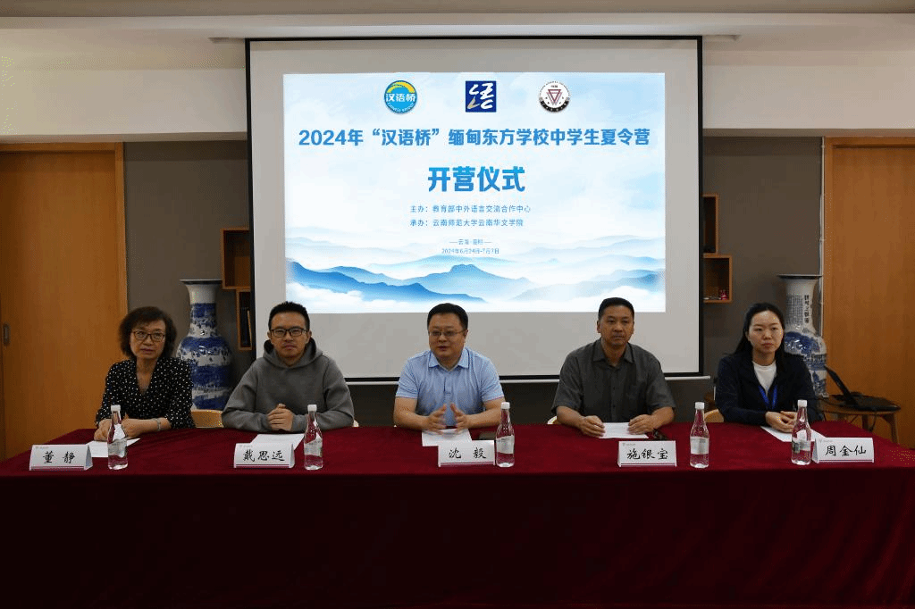 6月25日上午,2024年“汉语桥”缅甸东方学校中学生夏令营在云南师范大学开营。汉语国际推广师资培训基地(昆明)常务副主任沈毅、云南华文学院副院长施银宝、缅方带队教师周金仙、汉推基地办工作人员以及17位缅甸营员参加了开营仪式。