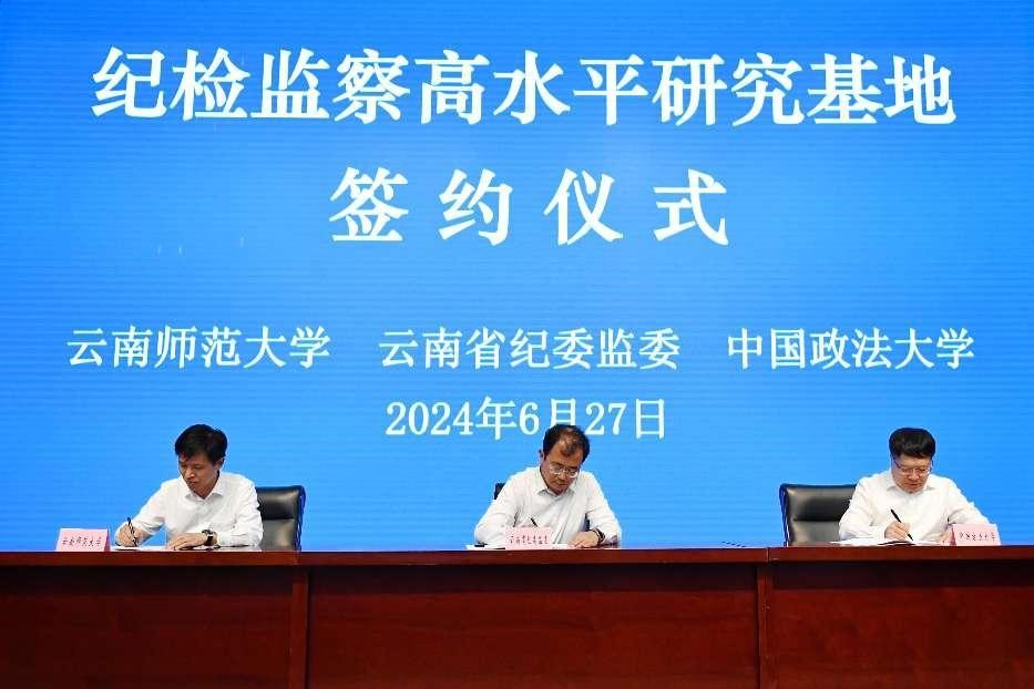 6月27日下午,我校与云南省纪委监委、中国政法大学在昆举行“纪检监察高水平研究基地”签约仪式。云南省纪委监委领导班子成员、各部门主要负责人,云南省纪检监察学会会员代表参加签约仪式。中国政法大学副校长常保国、我校党委书记张祖武出席仪式并致辞,我校校长胡金明代表学校签订《“纪检监察高水平研究基地”合作共建协议》。