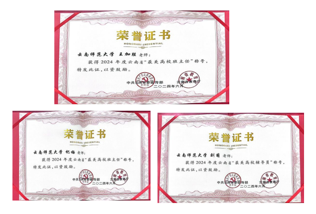 为选树新时代高校辅导员、高校班主任先进榜样,激发广大辅导员、班主任的荣誉感、责任感和使命感,3月以来,省委宣传部、省教育厅共同组织开展了2024年度云南省最美高校辅导员和班主任推选展示活动。经层层推荐、材料评审、现场答辩、电话访谈等环节,共推选出20名云南省2024年度“最美高校辅导员”及20名“最美高校班主任”。我校地理学部班主任王加胜老师、法学与社会学学院班主任杞梅老师在本次评选中荣获“最美高校班主任”称号,信息学院辅导员刘萌老师荣获“最美高校辅导员”称号。