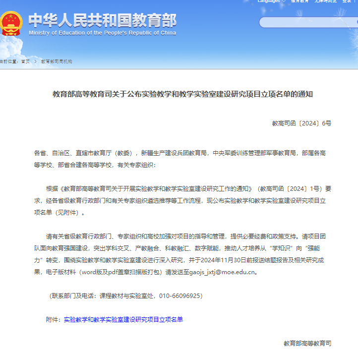 近日,教育部高等教育司发布《关于公布实验教学和教学实验室建设研究项目立项名单的通知》,公布了全国234个实验教学和教学实验室建设研究项目立项名单。我校郑永刚教授主持的《基础物理实验数字化资源建设》项目成功获批,这是学校首次获得国家级实验教学研究项目立项,充分体现了学校面向教育强国建设,在学科交叉、产教融合、科教融汇、数字赋能方面精准发力,推动人才培养从“学知识”向“强能力”转变,取得了阶段性的建设成效,为学校进一步深化实验教学改革注入新的动力。