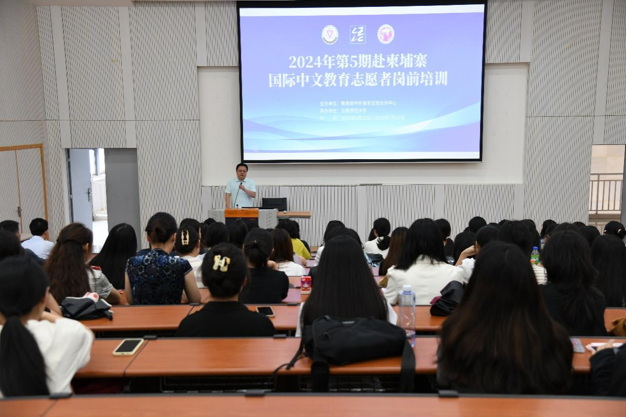 7月12日下午,由教育部中外语言交流合作中心主办、云南师范大学承办、汉语国际推广师资培训基地(昆明)执行的2024年第5期赴柬埔寨国际中文教育志愿者岗前培训结业典礼在我校举行。
