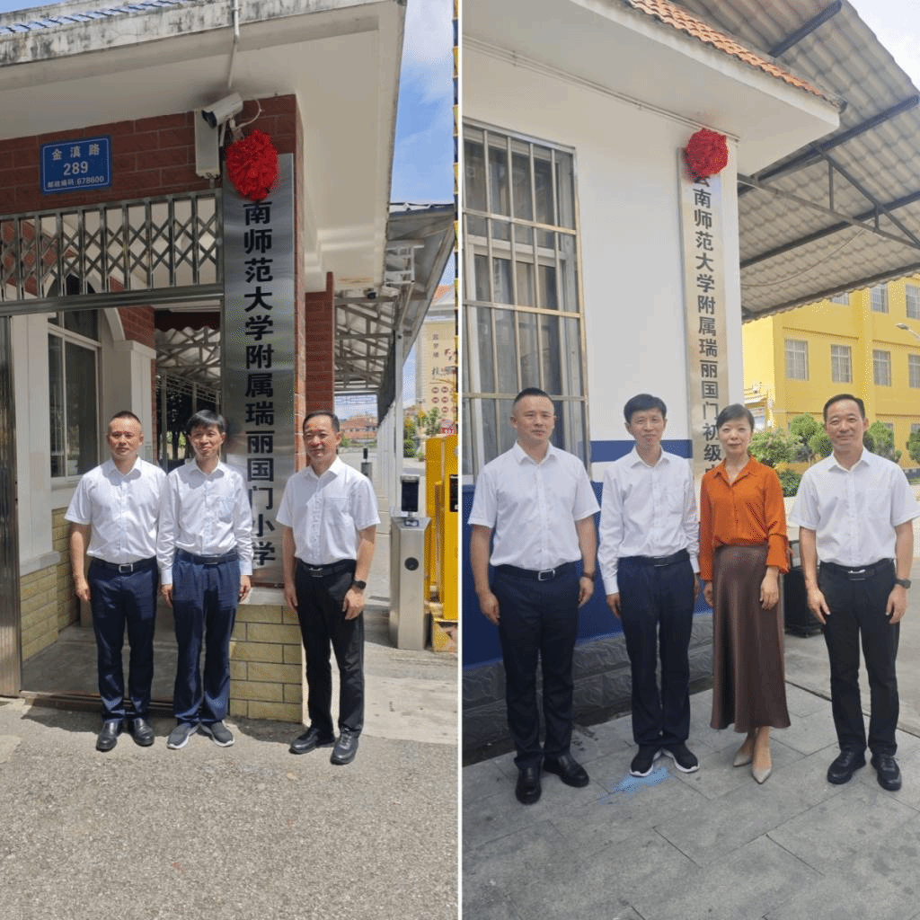 签约仪式后,胡金明一行前往瑞丽市,与德宏州委常委、瑞丽市委书记毛晓,德宏州副州长雪琳,瑞丽市市长温洋一同,为云南师范大学附属瑞丽国门小学、国门初级中学、国门高级中学揭牌。