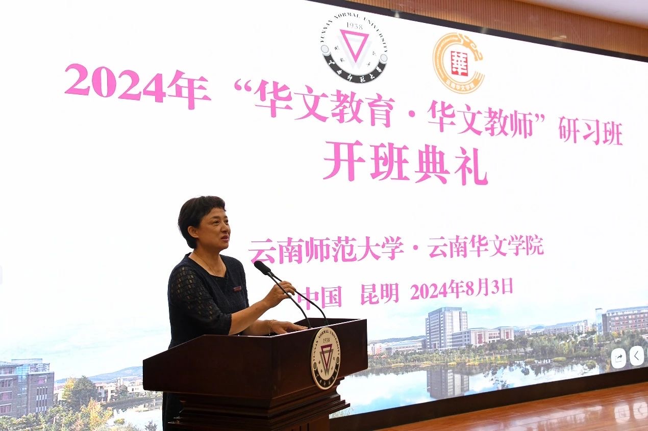 云南华文学院郭中丽教授代表授课教师发言,表示本次研习班授课教师都结合海外华文学校实际需求,精心准备教学内容、设计教学环节,除了专题讲座,还有实地考察和座谈交流,希望与各国华文教育同仁深入交流华文教育教学实践及前沿热点问题,互学互鉴,形成有益于华文教育事业发展的箴言良策。希望学员们在相互交流中不断探索海外华文教育的新趋势和新特点,促进教学内容、教学形式和教学方法的创新,共同提升华文教育教学能力。