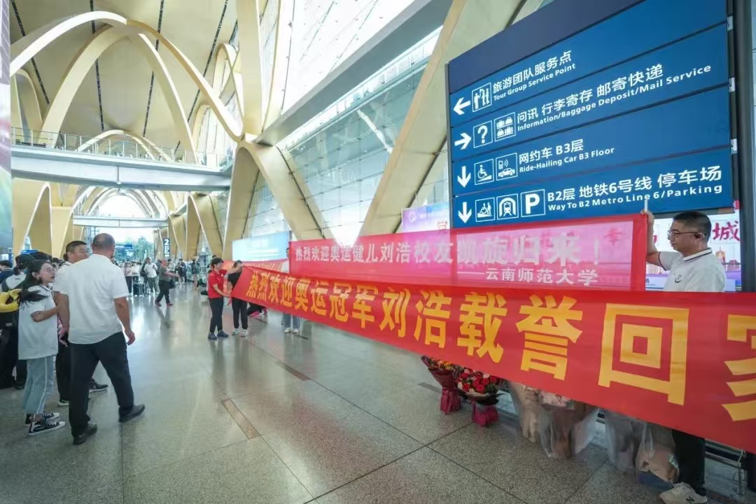 8月15日17时25分,奥运冠军刘浩乘坐的航班降落在昆明长水机场。在航站楼到达口,我校师生热切等待刘浩凯旋。17时45分,终于迎来期盼的时刻,当刘浩从出口处走出,接机人群中响起阵阵掌声和欢呼声。“欢迎回家”“辛苦了”……,大家高喊着刘浩的名字,现场气氛十分热烈。我校师生举起“热烈欢迎奥运健儿刘浩校友凯旋归来”的横幅,学生代表为他送上精心准备好的鲜花。