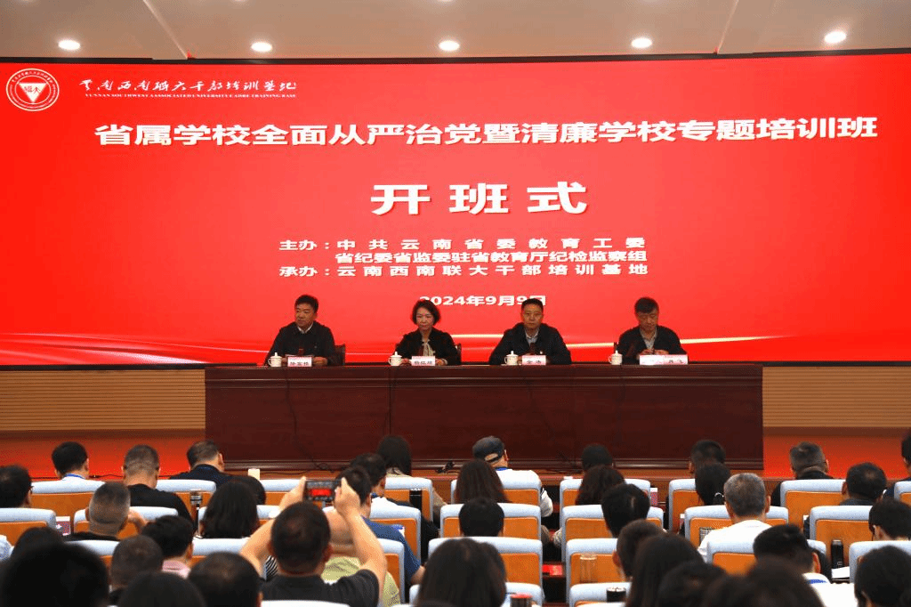 9月9日,由省委教育工委、省纪委省监委驻省教育厅纪检监察组主办,我校西南联大干部培训基地承办的省属学校全面从严治党暨清廉学校专题培训班在我校开班。省委教育工委委员、省教育厅党组成员、省政府教育督导团总督学杨红琼,省纪委省监委驻省教育厅纪检监察组组长金涛,我校党委副书记降富楼出席开班式,杨红琼作动员讲话,降富楼致辞。开班式由西南联大干部培训基地执行主任肖飞主持。来自全省公办高校的纪检、招生、基建、物资、财务、科研、后勤、组织人事部门共230名干部参加培训。