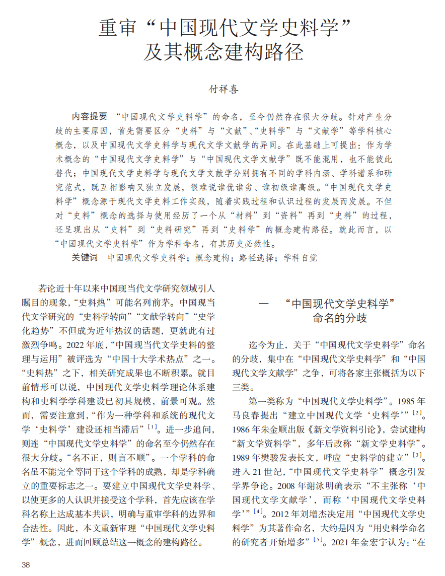 付祥喜教授长期致力于中国现当代文学史料研究,相关成果丰硕。这篇论文是为付教授主持的国家社科基金重点项目“中国现代文学史料学理论研究”阶段性成果。该文通过重审“史料”与“文献”、“史料学”与“文献学”等学科核心概念,区分中国现代文学史料学与现代文学文献学的异同,梳理分析了至今仍然存在很大分歧的“中国现代文学史料学”的命名,并探讨了这一概念的建构路径。