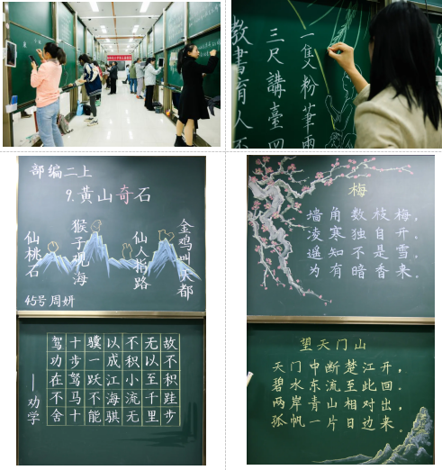 “三尺讲台存岁月,一支粉笔写春秋”。粉笔字板书不仅是一项教学技能,也是课堂艺术的体现。选手们态度严谨,书写规范,字体端庄秀丽,布局严谨合理,将文字的美感与教学实用性巧妙融合。部分参赛选手充分利用现场的彩色粉笔作画,文字与图画相映成趣。