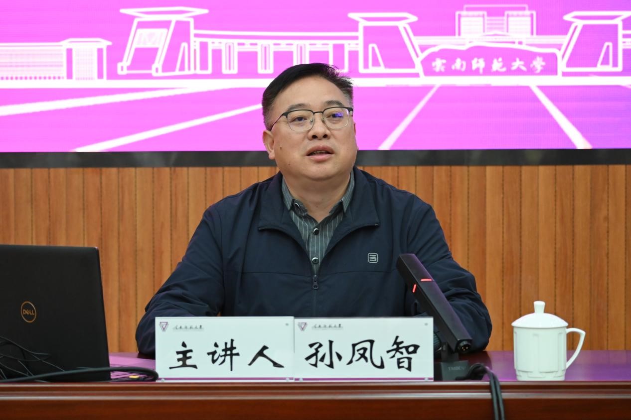 孙凤智从习近平生态文明思想的深刻内涵、云南贯彻习近平生态文明思想取得积极进展、深入贯彻落实习近平生态文明思想的思考三个方面深入讲解了习近平生态文明思想的深刻内涵、核心要义和实践要求,系统阐述了云南省在践行习近平生态文明思想中的经验做法以及推进生态文明建设的成效。他指出,云南作为国家重要的生物多样性宝库和西南生态安全屏障,最大的优势在生态、最大的潜力在生态。要更加突出生物多样性热点地区实现人与自然和谐共生、突出生态资源富集地区实现绿色低碳高质量发展、突出民族文化丰富地区实现优秀生态文化传承、突出跨境地区区域实现生态环境保护交流合作,致力打造生物多样性保护与社区可持续发展典范、生态经济产业培育典范、生态和谐绿美城乡建设典范、典型脆弱生态系统自然修复典范、民族优秀生态文化传承弘扬典范、区域命运共同体合作交流典范、齐抓共管的保障能力提升典范。他寄语广大师生做“绿水青山就是金山银山”生态理念的积极传播者和模范践行者,形成共同参与环境保护的良好风尚。