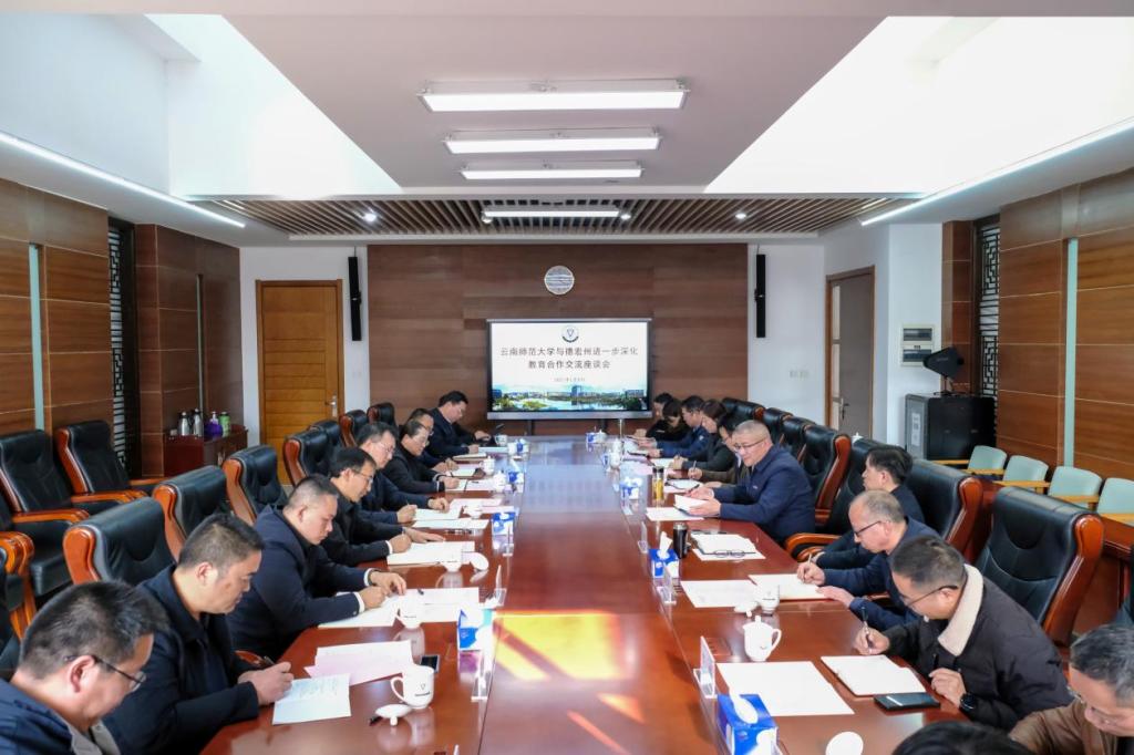 1月8日,云南师范大学与德宏州进一步深化教育合作交流座谈会在呈贡校区召开。本次座谈会旨在深化校地双方在教育、科技、人才培养等领域的合作,共同推动德宏经济社会高质量发展。校党委书记张祖武,校长胡金明,副校长武友德,学校相关职能部门负责人,德宏州委书记姜山,德宏州教育体育局、瑞丽市人民政府相关负责人参加座谈。座谈会由张祖武主持。