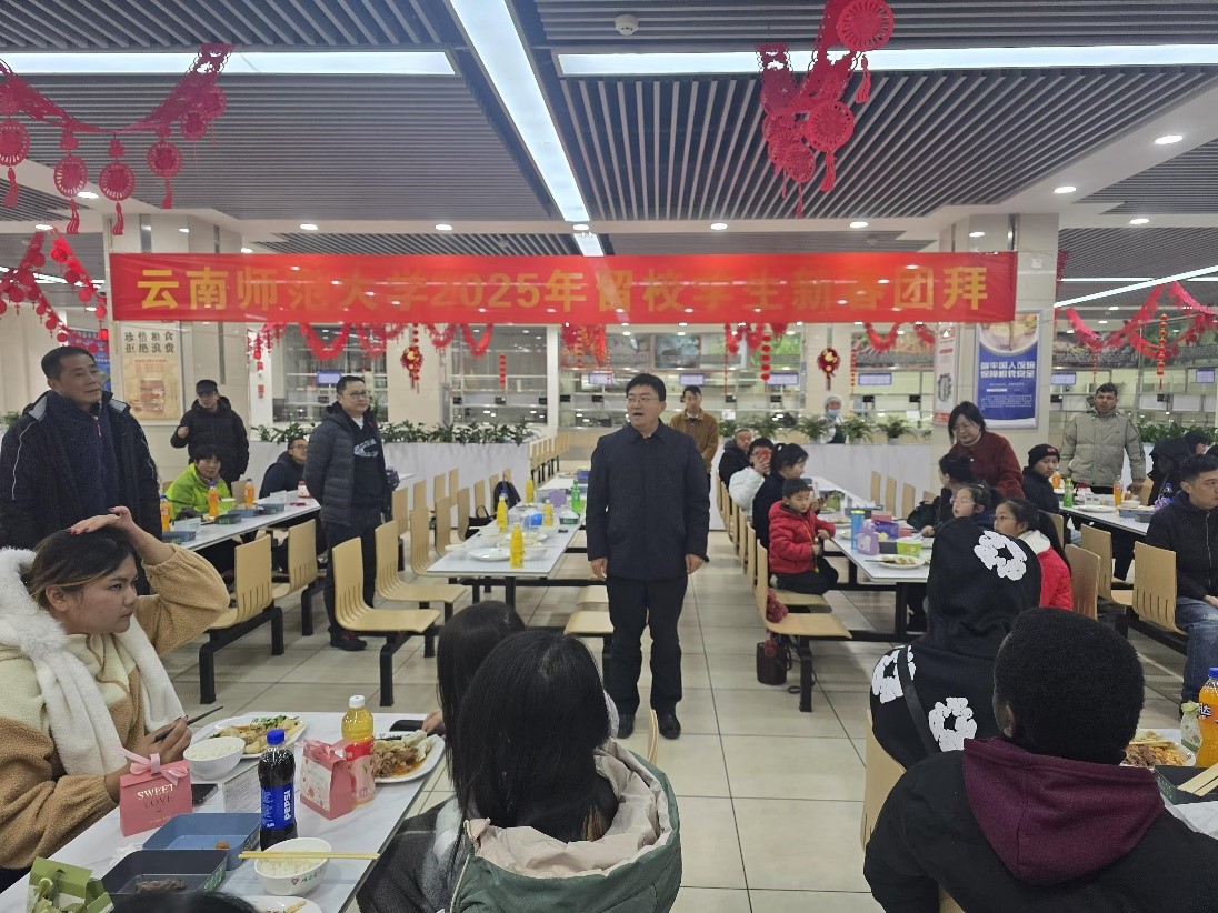 在新春佳节来临之际,1月28日(除夕),我校呈贡校区和园食堂张灯结彩、年味浓浓,2025年寒假留校学生新春团拜会在这里举行。师生欢聚一堂,共迎蛇年新春。校党委副书记降富楼、副校长徐锐出席新春团拜会。降富楼致辞,向寒假留校学生致以亲切问候和新春祝福。校办、学生处、云南华文学院、保卫处、后勤保障服务中心、相关学院(学部)负责人与寒假留校学生一同参加了活动。