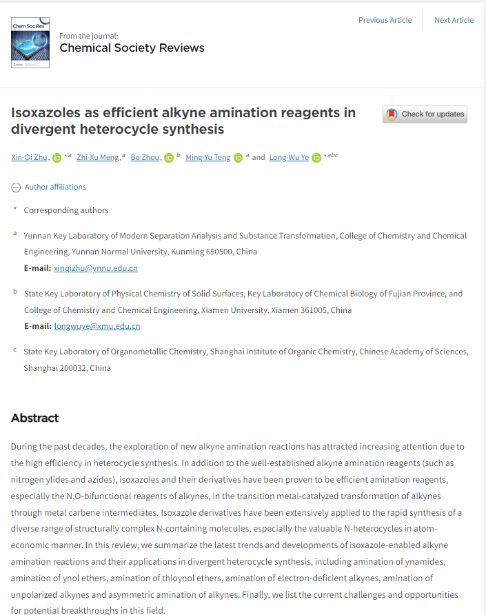 近日,我校化学化工学院朱欣祺研究员、柔性引进高层次人才叶龙武教授等在国际期刊《Chemical Society Reviews》(影响因子40.4)上发表题为“Isoxazoles as efficient alkyne amination reagents in divergent heterocycle synthesis”的综述论文。第一作者兼通讯作者是学院高层次引进人才朱欣祺研究员,学院高层次柔性引进人才、厦门大学化学化工学院叶龙武教授为共同通讯作者,论文第二作者为学院2022届硕士研究生孟芷旭。据“Web of Science”检索发现,该论文是首次以云南师范大学为第一单位在《Chemical Society Reviews》发表的高水平综述论文,也是目前为止化学化工学院影响因子最高(IF=40.4)的论文。该工作得到了国家自然科学基金项目(22101238, 22125108, 22331004)的资助。