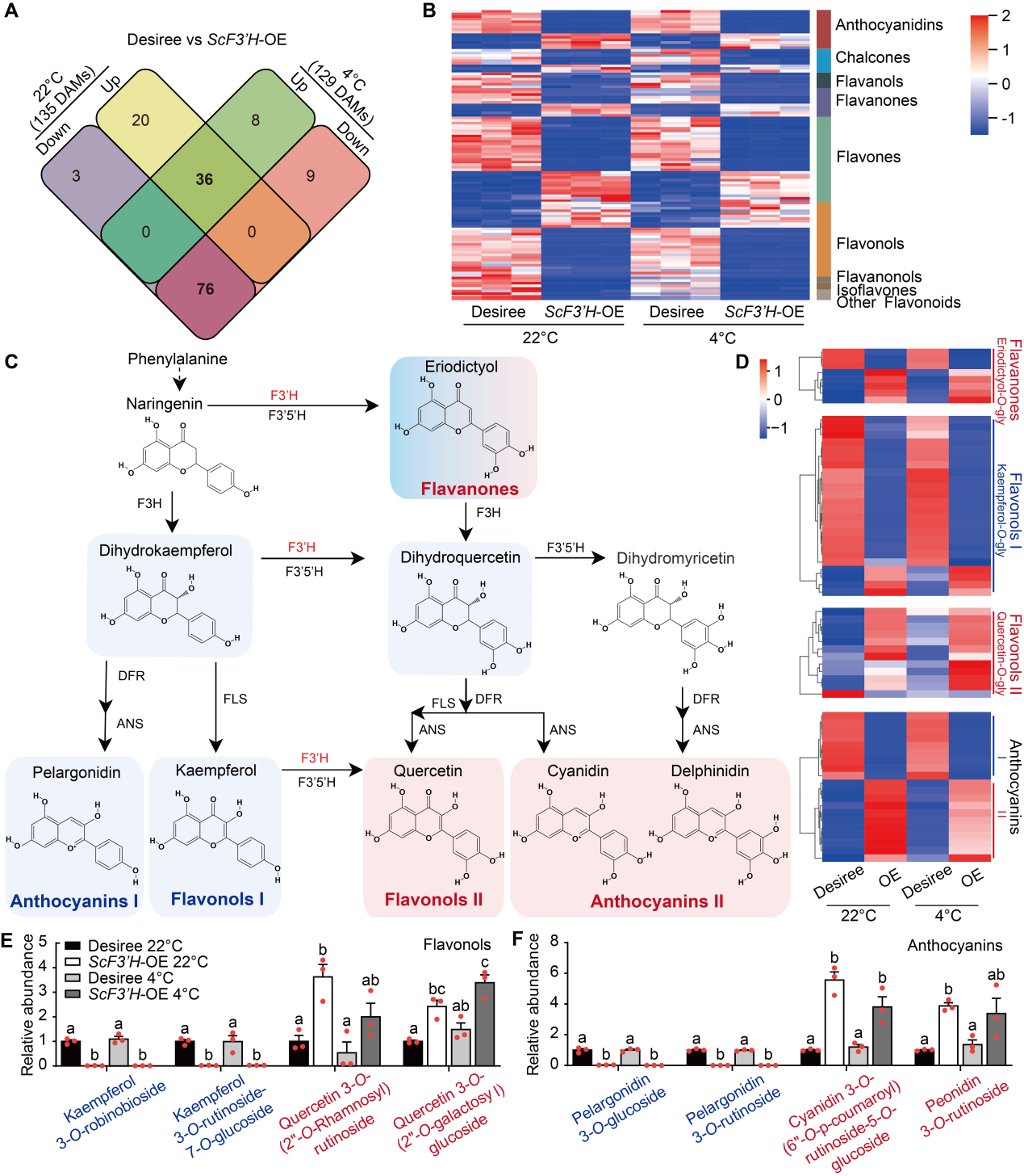 F3’H是调节花青素和黄酮醇合成的关键酶。在ScF3’H-OE材料中,二氢山柰酚、山奈酚-O-glys和天竺葵苷显著减少,而圣草酚-O-glys、槲皮素-O-glys和相关花青素积累。槲皮素由于其芳香B环上存在更多的羟基(-OH)基团,具有更强的自由基清除活性(图2)。