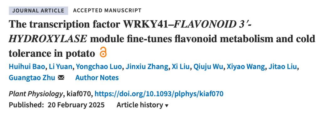 近日,由云南师范大学祝光涛团队在《Plant Physiology》(生物学1区Top)在线发表了题为“The transcription factor WRKY41–FLAVONOID 3′-HYDROXYLASE module fine-tunes flavonoid metabolism and cold tolerance in potato”的研究论文,该论文揭示了响应低温的ScWRKY41通过促进ScF3’H表达和调控类黄酮代谢提高马铃薯耐寒性的分子机制。