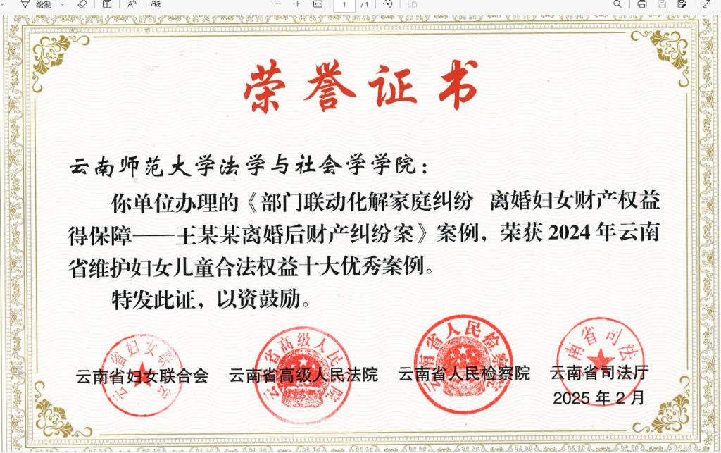 由云南省妇女联合会、云南省高级人民法院、云南省人民检察院、云南省司法厅共同评选的“云南省维护妇女儿童合法权益十大优秀案例”揭晓,法学与社会学学院参与办理的《部门联动化解家庭纠纷 离婚妇女财产权益得保障——王某某离婚后财产纠纷案》案例入选。该案不仅解决了离婚妇女财产分割难题,还通过多方联动机制有效化解了社会风险,实现了法律效果与社会效果的有机统一,为类似婚姻家庭纠纷的化解提供了实践范例。