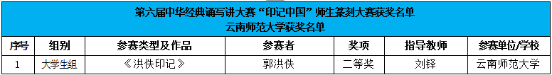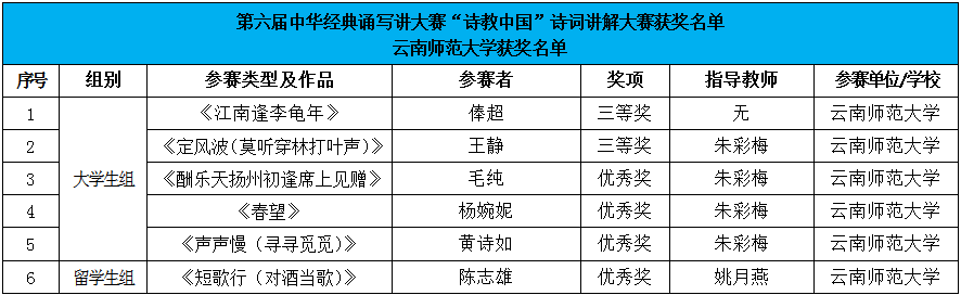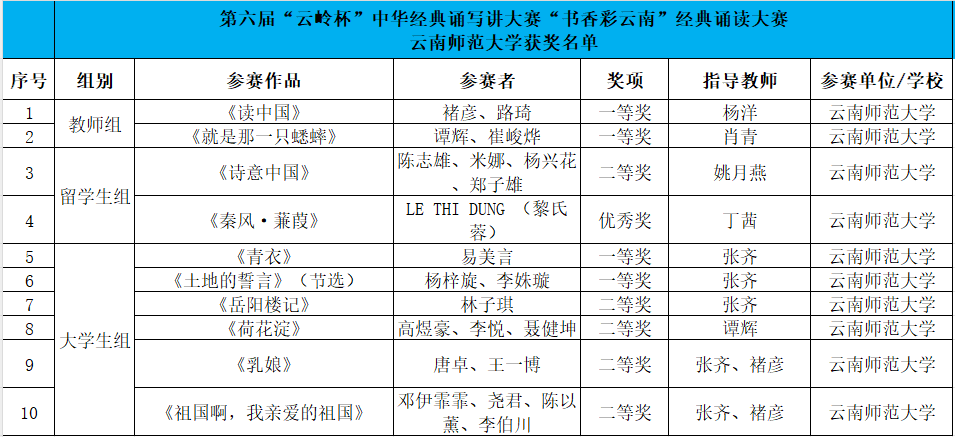在第六届中华经典诵写讲大赛云南省选拔赛——由云南省语委、教育厅主办的第六届“云岭杯”中华经典诵写讲大赛中,我校共有28件作品获奖。在“书香彩云南”经典诵读大赛中,获大学生组一等奖2项、二等奖4项,留学生组二等奖1项、优秀奖1项,教师组一等奖2项;在“墨香彩云南”书写大赛中,获大学生组一等奖1项、二等奖3项、三等奖4项,教师组一等奖1项、二等奖1项、三等奖1项;在“诗意彩云南”诗词讲解大赛中,获大学生组二等奖1项、三等奖4项、优秀奖1项,留学生组优秀奖1项;共获“优秀指导教师奖”4项。
