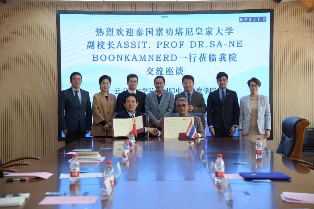3月12日上午,泰国素叻他尼皇家大学副校长兼人文社会学院院长萨内·汶坎纳德一行访问我校。双方围绕中泰教育合作举行座谈并签署新一轮“2+2”中文人才培养合作协议。我校副校长陈飞出席会议并致辞,萨内·汶坎纳德和云南华文学院院长王秀成签署协议,对外合作交流处处长杨叶华等参加座谈。