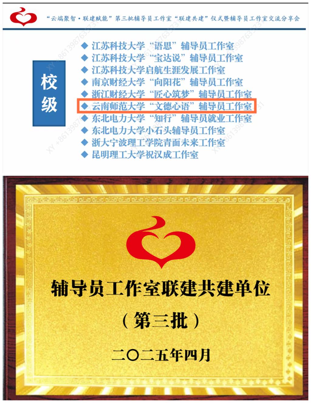 4月13日,由全国高校辅导员工作室联盟主办的“云端聚智·联建赋能”第三批高校辅导员工作室“联建共建”仪式暨辅导员工作室交流分享会顺利举行。此次联建共建成员单位包含国家级、省级、校级名师辅导员工作室。经过遴选,云南师范大学“文德心语”辅导员工作室凭借良好的建设成效和鲜明的育人特色,入选第三批全国高校辅导员工作室“联建共建”成员单位。