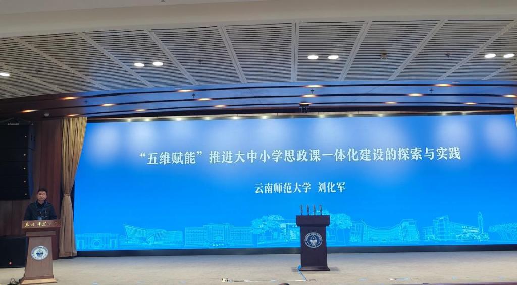 经验交流环节,我校马克思主义学院院长刘化军以“‘五维赋能’推进大中小学思政课一体化建设云师模式的探索与实践”为题,在大会作工作经验分享,经过五年实践,“五维赋能”云师模式已显现三大成效,一是建成覆盖全省的思政课教师发展共同体,二是形成具有云南标识度的课程资源体系,三是打造了可推广的边疆民族地区思政育人方案。