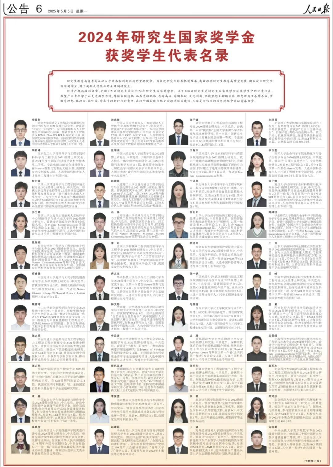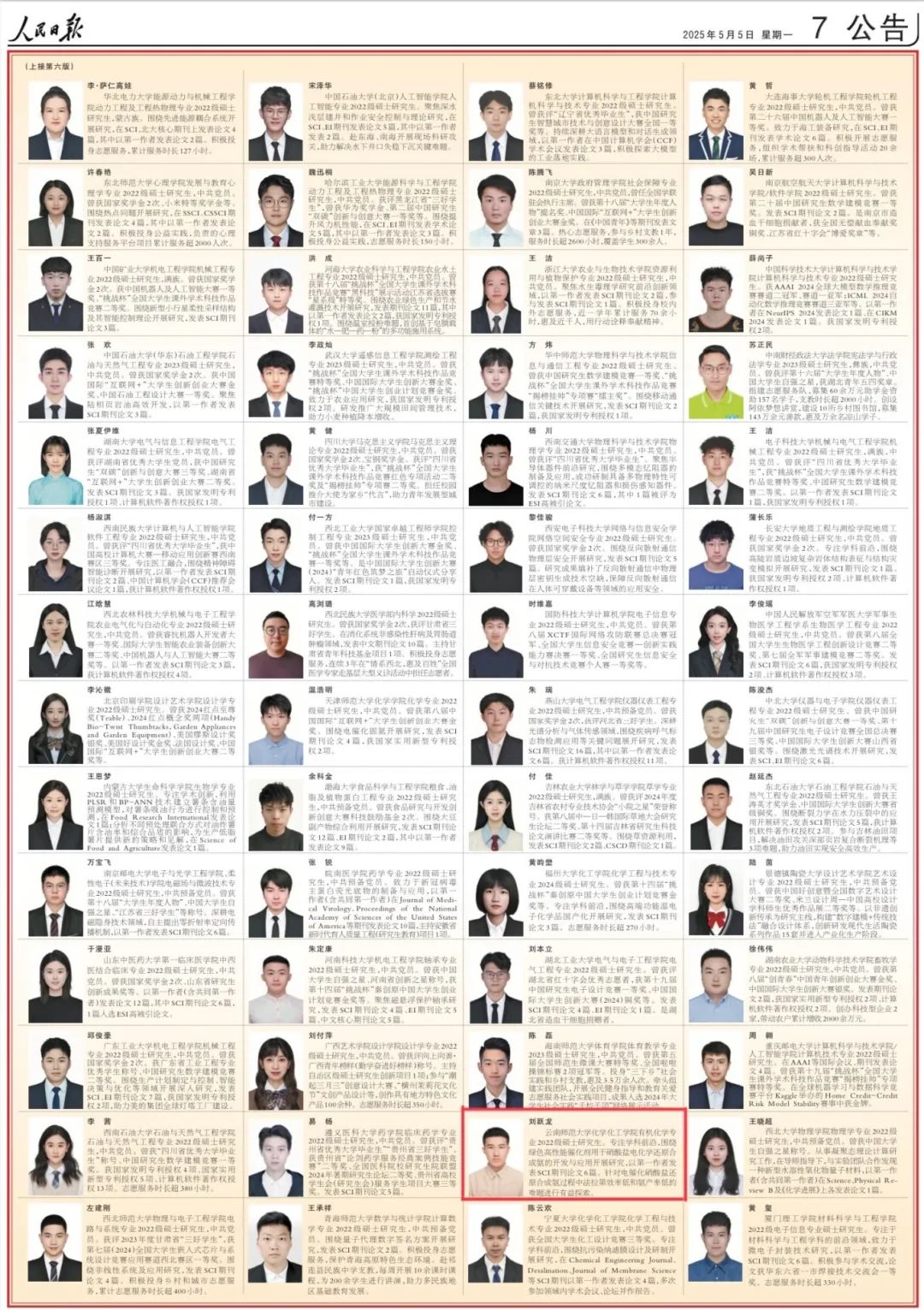 5月5日,《人民日报》刊登《2024年研究生国家奖学金获奖学生代表名录》。我校化学化工学院硕士研究生刘跃龙入选名录。