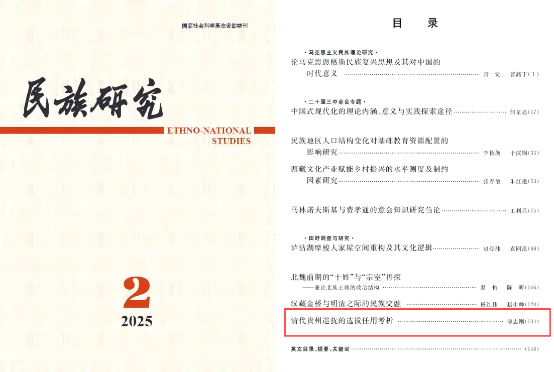 日前,我校学科建设办公室谭志刚副教授在《民族研究》2025年第2期发表学术论文《清代贵州巡抚的选拔任用考析》,该文是依托国家社会科学基金中国历史研究院重大历史问题研究专项“清代大一统国家边疆民族治理对中华民族共同体的形塑研究”取得的标志性阶段成果。