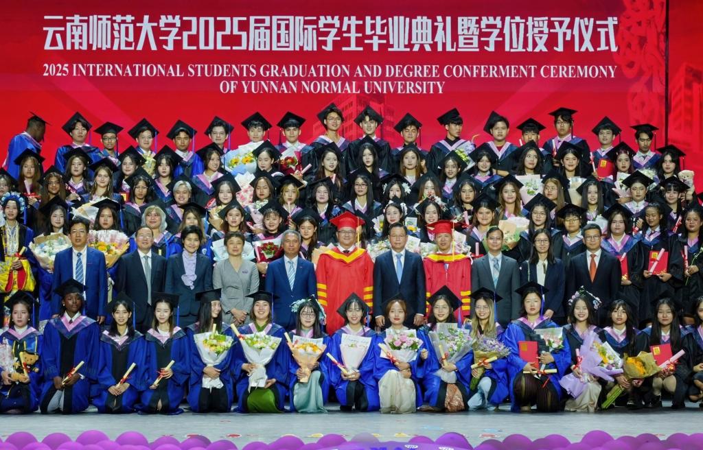 典礼最后,全体人员在演播厅内合影留念。从“相遇云师”到“逐梦全球”,2025届国际毕业生们将从云南师范大学出发,带着中国故事与云师印记,奔赴世界舞台,书写属于自己的精彩篇章。