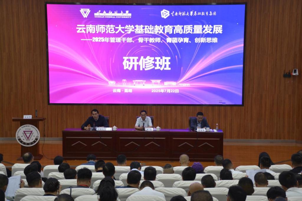 7月22日,云南师范大学基础教育高质量发展——2025年管理干部、骨干教师能力提升研修班、“青蓝教师孕育计划”及创新思维训练营在我校呈贡校区汇学2栋101报告厅开班,开班式以“主会场+分会场”云端联动的方式举行。副校长陈飞,基础教育集团领导班子成员,全省10个地州21个县市区32所学校的优秀教师、管理骨干、“青蓝教师孕育计划”入库教师、创新思维训练营学生共计800余名学员参加。开班式由基础教育集团主任王玉光主持。