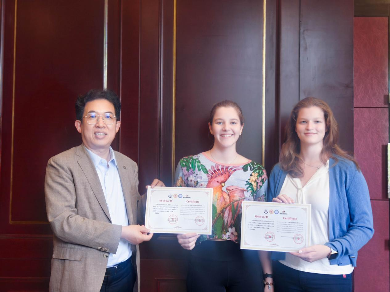 云南师范大学国际中文教育学院院长王秀成向全体学员颁发证书,德中文化教育友好协会向国际中文教育学院赠送锦旗。