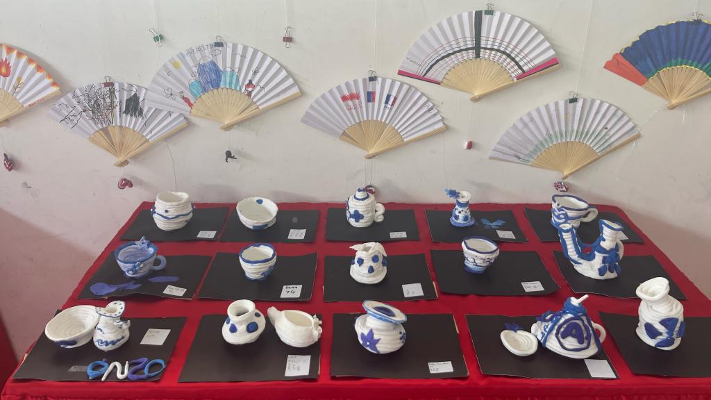 营员们通过11天的学习,初步掌握了丰富多彩的中华文化技能。营员们在结营仪式上表演了《半个月亮爬上来》《茉莉花》等民歌以及佤族舞蹈《黑珍珠》、藏族舞蹈《次仁拉索》、傣族舞蹈《傣家小妹》等中国少数民族舞蹈;武术舞龙的融合展演彰显了青春、动感与活力;非遗手工课作品展让营员们感受了剪韵、染趣;书法展以文字为载体,传递了“墨韵中华”;国画作品则展现了彩墨流转间晕染出的风雅气韵。教师团代表何纾老师与杨江波老师携手带来《锦瑟》,伴随着歌唱家歌声旋律婉转起伏,书法家现场泼墨挥毫,乐声与墨香交织,声韵美感与书法意蕴相融,将汇报演出氛围推向高潮。最后,营员代表展示了亲手制作的瓦猫工艺作品。