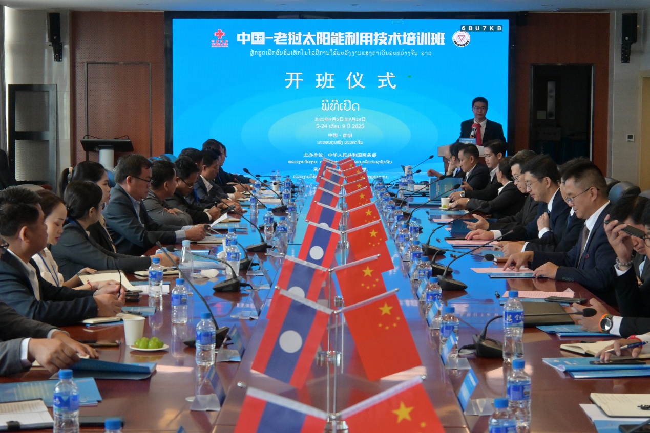 2025年9月5日上午,商务部“中国—老挝太阳能利用技术国际培训班”在昆明开班。本次培训班由中华人民共和国商务部主办,云南师范大学承办。云南省商务厅对外经济合作处四级调研员罗永锋,云南师范大学副校长徐锐,对外合作交流处处长杨叶华、能源与环境科学学院班子成员,以及部分教师代表和培训班全体学员参加开班式。开班式由云南师范大学能源与环境科学学院院长陈玉保主持。