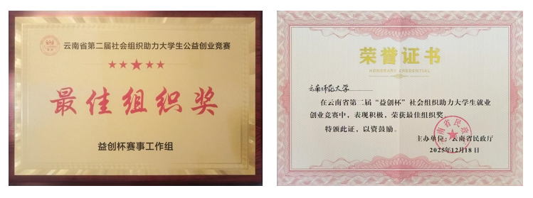 12月18日,第二届“益创杯”社会组织助力大学生公益创业竞赛顺利落幕。竞赛由云南省民政厅主办,云南省社会组织促进会承办,云南连心社区照顾服务中心联合承办。我校学子在比赛中表现突出,获银奖1项、优秀奖5项,学校获评“最佳组织奖”。