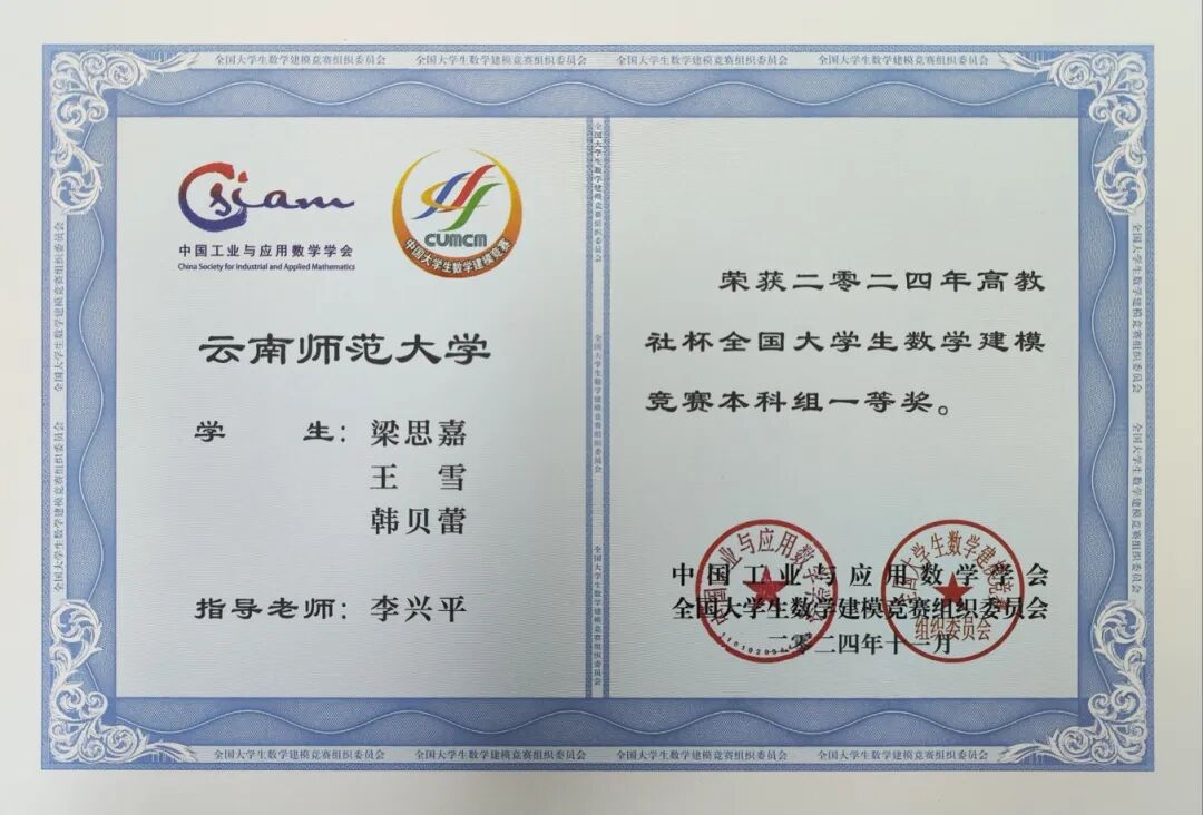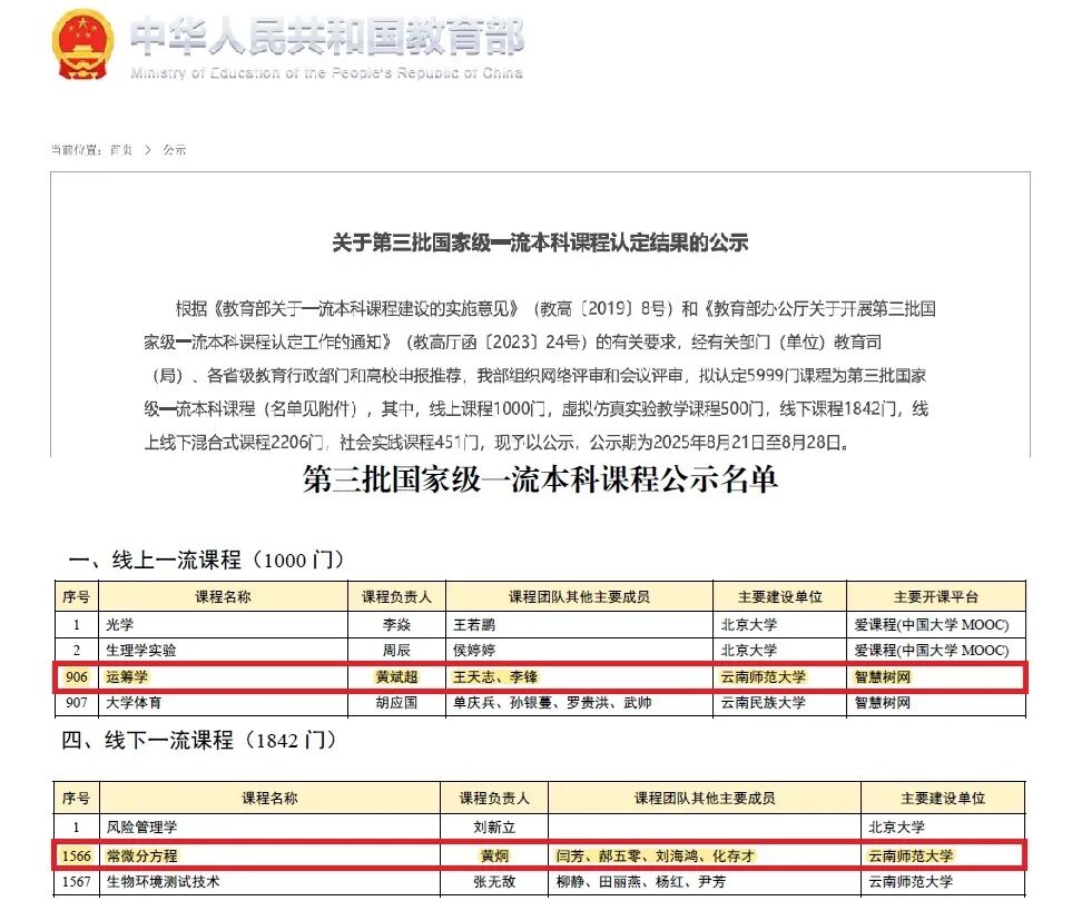 本科教育教学水平显著提升。数学与应用数学专业通过教育部师范专业二级认证,获批2门国家一流课程、4门省级一流课程,64门课程获评校级A/B 类,数量居学校理科院系首位;“统计学”专业入选云南省一流本科专业建设点。2023年本科教学工作考核获学校理科组第一名,2024年获第二名。成立“数学拔尖创新人才培养研究中心”,制定“武之”拔尖班培养方案,开设本科生数学与应用数学专业“武之”拔尖班。顺利完成本科教育教学审核评估。