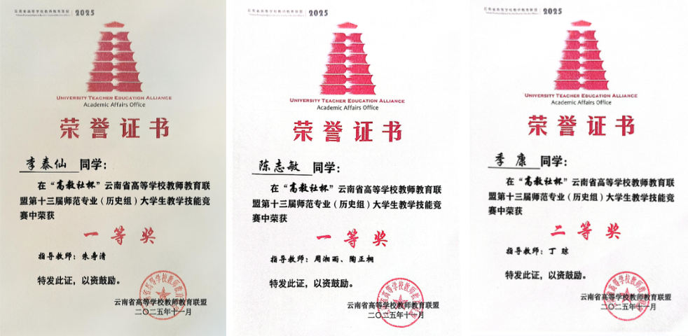 学科竞赛成绩显著。学生获国家级(含部委)教学竞赛奖励14项。其中“田家炳杯”教育硕士教学技能大赛8项、全国统编历史教材“精彩一课”教学大赛4项、全国“田家炳杯”师范院校师范生教学竞赛1项;本科生获省厅级以上教学竞赛奖励16项,获国家级创新创业大赛立项5项、省级19项。本科生项目获云南省第十三届“挑战杯”大学生课外学术科技作品竞赛特等奖,获第十九届“挑战杯”全国大学生课外学术科技作品竞赛三等奖。1项模拟政协提案获共青团中央“优秀模拟政协提案作品”,1项获共青团中央优秀奖及云南省二等奖。