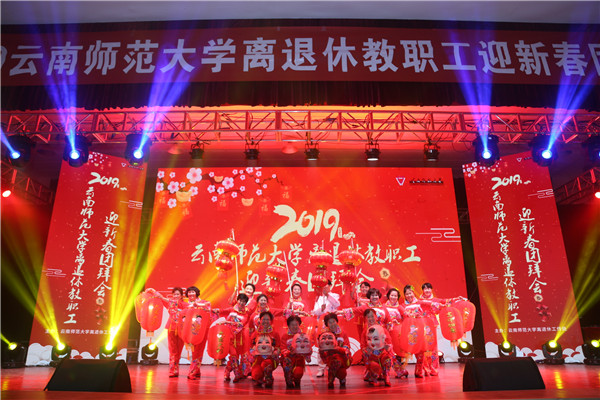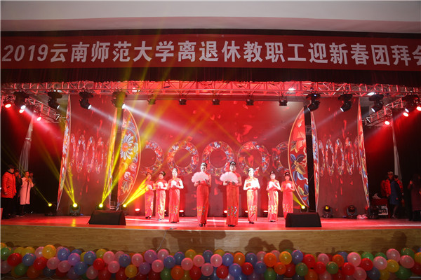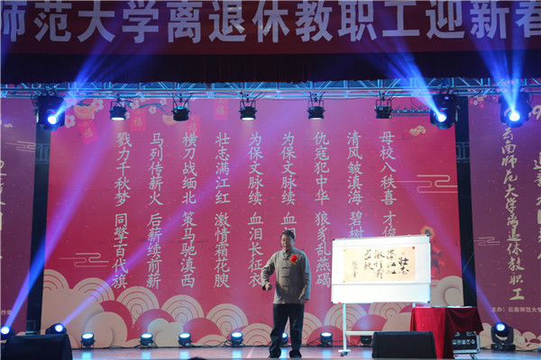 内容丰富,形式完整的时装秀——《盛世霓裳·和谐》的表演,拉开了文艺演出、互动环节的序幕。欢快、喜庆、祥和的团拜会现场,张旭老师挥毫泼墨的洒脱范,朗诵自创古体诗的声姿赢得了场下观众们阵阵热烈掌声。离退休教职工各文艺团体带来的歌舞表演,让现场的观众们感受到了浓浓的年味。送春联、砸金蛋的互动环节,让老同志们收到了新年的幸运与祝福。团拜会在全场人员高唱的《歌唱祖国》中圆满结束。