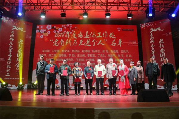 离退休教职工党委书记王琼玲同志宣读《2018年离退休教职工“老有所为”先进个人表彰决定》,对退而不休,不忘初心,驰而不息,老有所为,为党和国家、社会和学校奉献余热的吴宝璋、杨修品、唐增强等老专家、老教授进行表彰。离退休工作领导小组成员单位及职业技术教育学院负责人为“老有所为先进个人”颁发荣誉证书。团拜会上,对2018年度光荣退休的教职工进行答谢。岁月承载着历史的步伐,曾经的意气风发、豪情壮志已化作汗水和热血洒在讲台上、校园里,如今告别了繁忙,辞别了劳作,留下的是记录业绩的银发,躬耕教育脊土的皱纹。离退休工作处主要领导给新退休的教师们颁发退休纪念杯,感谢他们把人生最美好的年华奉献给了学校。