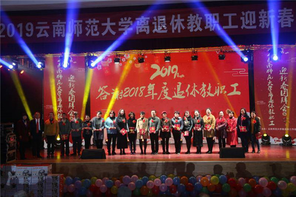1月10日下午,在新春佳节到来之际,我校离退休教职工欢聚一堂,在一二一西南联大校区离退休教职工西院活动中心举行离退休教职工2019年迎新春团拜会。参加会议的有离退休教职工2018年度受表彰的老有所为先进个人,2018年度退休教职工,学校老领导,离退休工作领导小组成员单位负责人,职业技术教育学院负责人,离退休教职工党委总支书记、副书记、支部书记、支委,离退休教职工各团体协会负责人、行政组长、活动中心(室)管理员共200余人。团拜会由退休教师周林主持。