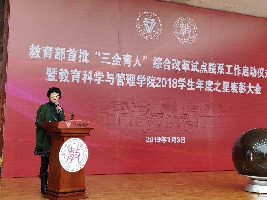 为深入学习贯彻习近平总书记在全国宣传思想工作会议重要讲话精神,根据教育部相关工作要求,进一步好落实建设任务和建设标准,教育科学与管理学院于2019年1月3日在汇文楼3区105报告厅举行了教育部首批“三全育人”综合改革试点院系工作启动仪式暨教育科学与管理学院2018学生年度之星表彰大会。本次活动得到了校党委副书记张玮、副校长刘坚的指导,党委宣传部、学生工作部(处)、校团委、研究生部相关负责人出席活动,教育科学与管理学院党政领导班子、全体教职工、学生代表共400余人参加活动,活动由教育科学与管理学院党委副书记刘虹主持。