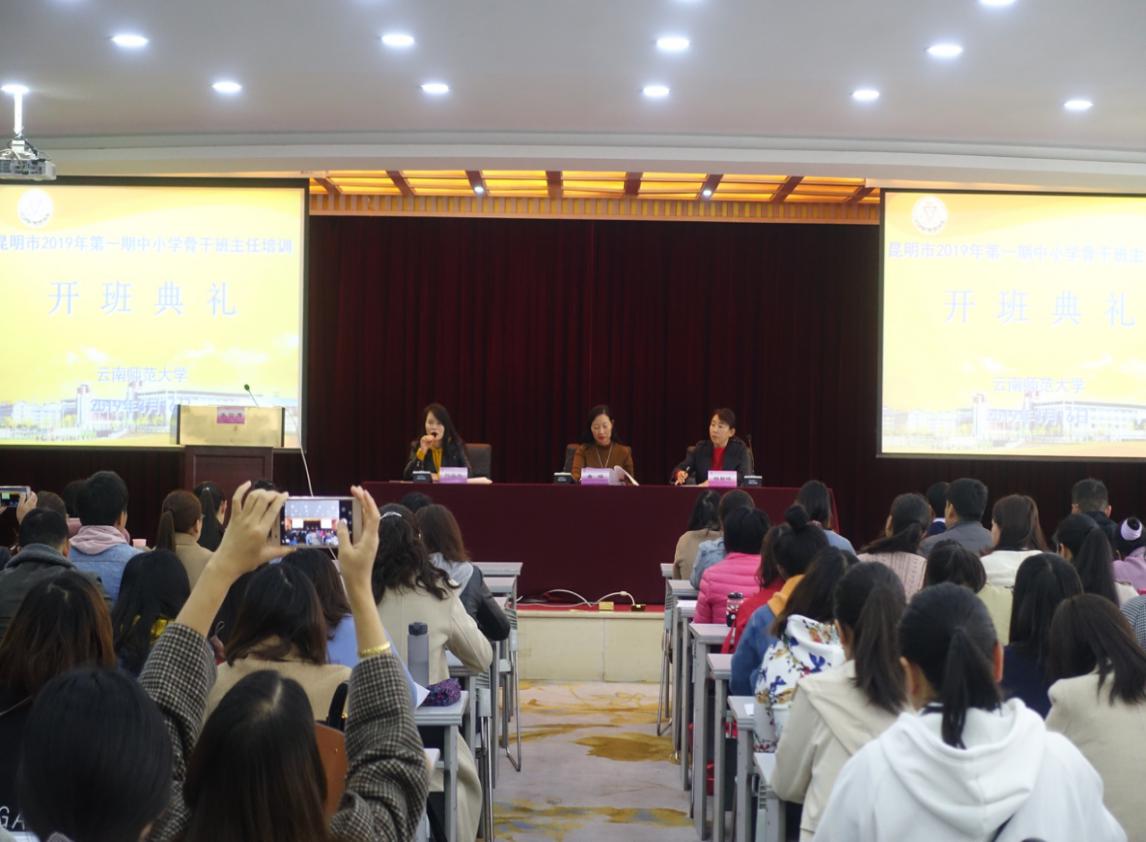 根据昆明市教育局与云南师范大学成人继续教育学院的教师培训合作协议,3月16-22日举办昆明市2019年第一期中小学骨干班主任培训,来自昆明市各县区共计153名中小学骨干班主任教师参加此次培训。3月16日上午,主办与承办双方在莲花宾馆四楼报告厅举行开班典礼,昆明市教育局师训处处长杨昭晖,成人继续教育学院院长唐瑛、副院长郭云聪,成教学院培训部全体教师及参训学员参加开班典礼。