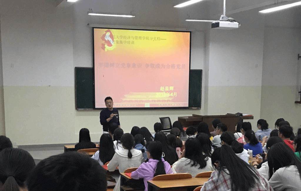 本次集中培训内容包括影视教育、专家讲座、结构化研讨、小组讨论四部分。4月19日晚,经管学院赵显辉副书记做开班教育,他要求参加培训的发展对象要认真学习党的理论知识,端正入党动机;要自觉遵守党校纪律,做学习的模范;要坚持理论联系实际,以实际行动争取早日入党。并以《牢固树立党章意识 争取成为合格党员》为主题对学员进行专题辅导,让学员认识学习《中国共产党章程》的重要意义,了解《中国共产党章程》的重要地位,对如何做合格党员有了更加全面的了解和深刻的认识。