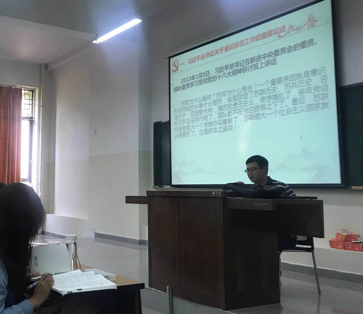 马克思主义学院庞申伟同志以《深入学习习近平总书记关于意识形态工作和宗教工作的重要论述》为主题,以前苏联抛弃马克思主义意识形态而解体的故事为例子,深入浅出,将意识形态工作的极端重要性深入每个学员脑中、心中,并要求学员要深入学习领会习近平总书记关于意识形态工作和宗教工作重要论述,清醒认识当前面临的复杂形势。