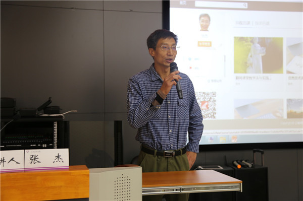 本次工作坊分为两个部分。第一部分的主要内容为“翻转课堂教学法探秘”,张杰老师通过对翻转课堂教学法的产生以及国内外翻转课堂的介绍进一步帮助老师理解翻转课堂的核心教育理念,了解翻转课堂及其理论依据、翻转课堂教学法提升成绩的秘密。第二部分的主要内容为“翻转课堂实践模型及案例设计与制作”,张杰老师通过学习任务单的设计、微课程设计与开发、课堂教学创新方式的设计与实施,结合如何制作PPT和微课视频、如何利用学习通平台等内容,引导参训老师们以小组为单位进行实际操作和训练。