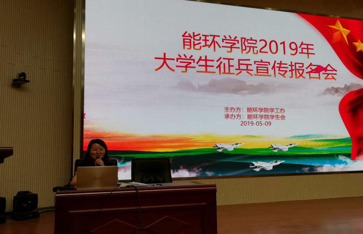 为进一步加强国防教育,积极引导广大青年学生关注国家安全形势、踊跃参与国防后备力量建设,激发参军报国热情,5月9日下午,能源与环境科学学院2019年大学生征兵宣传报名会在学院107报告厅举行,学院党委副书记范荣康老师、学院团委书记杨红老师以及研究生、本科生共计200余人参加了宣传报名会,会议由辅导员陈怀老师主持。