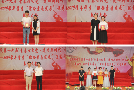 合唱比赛结束,举行了学院2018-2019学年学生“综合素质发展”优秀团体表彰大会,10个先进集体、2个优秀志愿者服务队、13个优秀获奖团队、2个省级创新创业获奖团队获得表彰,出席活动的嘉宾们为获奖团队颁奖。